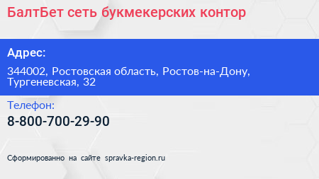 БалтБет, сеть букмекерских контор по адресу 344002, Ростовская область, Ростов-на-Дону, Тургеневская, 32 в дальнейшем Организация, размещена в следующих категориях: