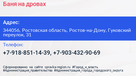 Баня на дровах по адресу 344056, Ростовская область, Ростов-на-Дону, Гуковский переулок, 31 в дальнейшем Организация, размещена в следующих категориях: