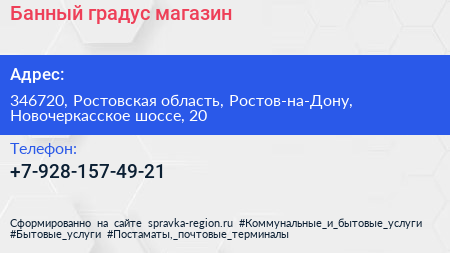 Банный градус, магазин по адресу 346720, Ростовская область, Ростов-на-Дону, Новочеркасское шоссе, 20 в дальнейшем Организация, размещена в следующих категориях: