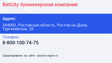 BetCity, букмекерская компания по адресу 344002, Ростовская область, Ростов-на-Дону, Тургеневская, 32 в дальнейшем Организация, размещена в следующих категориях: