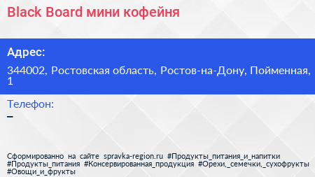 Black Board, мини-кофейня по адресу 344002, Ростовская область, Ростов-на-Дону, Пойменная, 1 в дальнейшем Организация, размещена в следующих категориях: