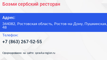 Боэми, сербский ресторан по адресу 344082, Ростовская область, Ростов-на-Дону, Пушкинская, 48 в дальнейшем Организация, размещена в следующих категориях: