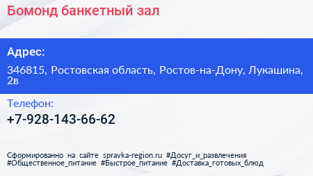 Бомонд, банкетный зал по адресу 346815, Ростовская область, Ростов-на-Дону, Лукашина, 2в в дальнейшем Организация, размещена в следующих категориях: