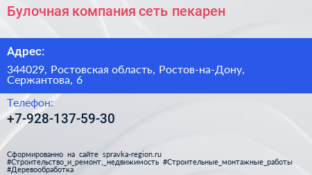 Булочная компания, сеть пекарен по адресу 344029, Ростовская область, Ростов-на-Дону, Сержантова, 6 в дальнейшем Организация, размещена в следующих категориях: