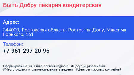 Быть Добру, пекарня-кондитерская по адресу 344000, Ростовская область, Ростов-на-Дону, Максима Горького, 161 в дальнейшем Организация, размещена в следующих категориях: