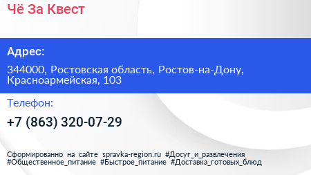 Чё За Квест по адресу 344000, Ростовская область, Ростов-на-Дону, Красноармейская, 103 в дальнейшем Организация, размещена в следующих категориях: