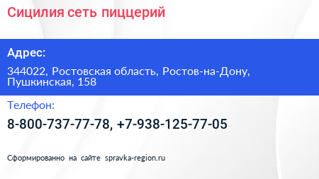 Cицилия, сеть пиццерий по адресу 344022, Ростовская область, Ростов-на-Дону, Пушкинская, 158 в дальнейшем Организация, размещена в следующих категориях: