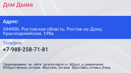 Дом Дыма по адресу 344000, Ростовская область, Ростов-на-Дону, Красноармейская, 198а в дальнейшем Организация, размещена в следующих категориях: