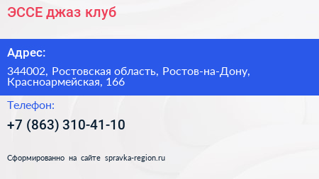 ЭССЕ, джаз-клуб по адресу 344002, Ростовская область, Ростов-на-Дону, Красноармейская, 166 в дальнейшем Организация, размещена в следующих категориях: