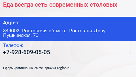 Еда всегда, сеть современных столовых по адресу 344002, Ростовская область, Ростов-на-Дону, Пушкинская, 70 в дальнейшем Организация, размещена в следующих категориях: