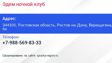 Эдем, ночной клуб по адресу 344101, Ростовская область, Ростов-на-Дону, Верещагина, 6а в дальнейшем Организация, размещена в следующих категориях: