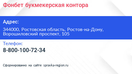 Фонбет, букмекерская контора по адресу 344000, Ростовская область, Ростов-на-Дону, Ворошиловский проспект, 105 в дальнейшем Организация, размещена в следующих категориях: