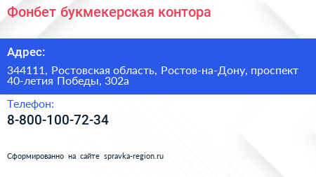 Фонбет, букмекерская контора по адресу 344111, Ростовская область, Ростов-на-Дону, проспект 40-летия Победы, 302а в дальнейшем Организация, размещена в следующих категориях: