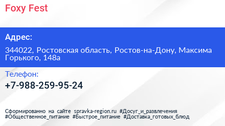 Foxy Fest по адресу 344022, Ростовская область, Ростов-на-Дону, Максима Горького, 148а в дальнейшем Организация, размещена в следующих категориях: