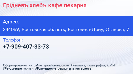 Грiдневъ-хлебъ, кафе-пекарня по адресу 344069, Ростовская область, Ростов-на-Дону, Оганова, 7 в дальнейшем Организация, размещена в следующих категориях: