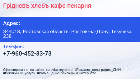 Грiдневъ-хлебъ, кафе-пекарня по адресу 344018, Ростовская область, Ростов-на-Дону, Текучёва, 238 в дальнейшем Организация, размещена в следующих категориях: