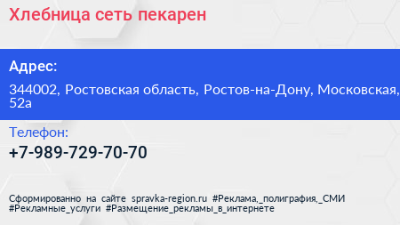 Хлебница, сеть пекарен по адресу 344002, Ростовская область, Ростов-на-Дону, Московская, 52а в дальнейшем Организация, размещена в следующих категориях: