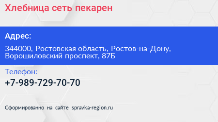 Хлебница, сеть пекарен по адресу 344000, Ростовская область, Ростов-на-Дону, Ворошиловский проспект, 87Б в дальнейшем Организация, размещена в следующих категориях: