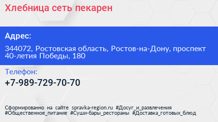 Хлебница, сеть пекарен по адресу 344072, Ростовская область, Ростов-на-Дону, проспект 40-летия Победы, 180 в дальнейшем Организация, размещена в следующих категориях: