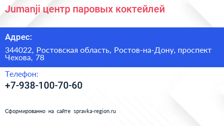 Jumanji, центр паровых коктейлей по адресу 344022, Ростовская область, Ростов-на-Дону, проспект Чехова, 78 в дальнейшем Организация, размещена в следующих категориях: