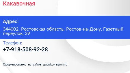 Какавочная по адресу 344002, Ростовская область, Ростов-на-Дону, Газетный переулок, 39 в дальнейшем Организация, размещена в следующих категориях: