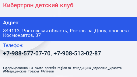 Кибертрон, детский клуб по адресу 344113, Ростовская область, Ростов-на-Дону, проспект Космонавтов, 37 в дальнейшем Организация, размещена в следующих категориях: