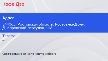 Кофе Дзо по адресу 344065, Ростовская область, Ростов-на-Дону, Днепровский переулок, 116 в дальнейшем Организация, размещена в следующих категориях: