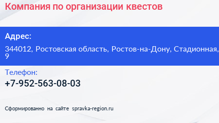 Компания по организации квестов по адресу 344012, Ростовская область, Ростов-на-Дону, Стадионная, 9 в дальнейшем Организация, размещена в следующих категориях: