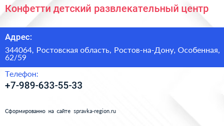 Конфетти, детский развлекательный центр по адресу 344064, Ростовская область, Ростов-на-Дону, Особенная, 62/59 в дальнейшем Организация, размещена в следующих категориях: