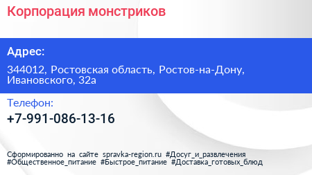 Корпорация монстриков по адресу 344012, Ростовская область, Ростов-на-Дону, Ивановского, 32а в дальнейшем Организация, размещена в следующих категориях:
