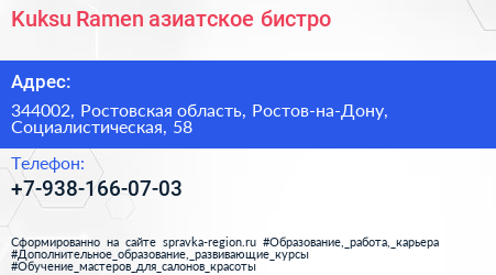 Kuksu Ramen, азиатское бистро по адресу 344002, Ростовская область, Ростов-на-Дону, Социалистическая, 58 в дальнейшем Организация, размещена в следующих категориях: