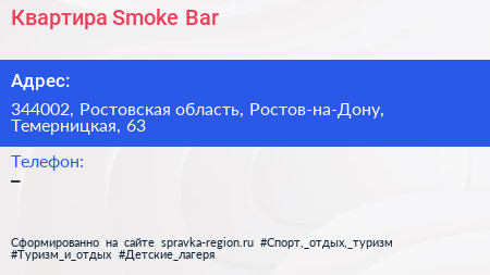 Квартира Smoke Bar по адресу 344002, Ростовская область, Ростов-на-Дону, Темерницкая, 63 в дальнейшем Организация, размещена в следующих категориях: