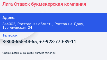 Лига Ставок, букмекерская компания по адресу 344002, Ростовская область, Ростов-на-Дону, Тургеневская, 24 в дальнейшем Организация, размещена в следующих категориях: