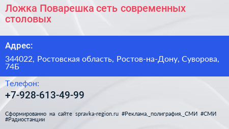 Ложка-Поварешка, сеть современных столовых по адресу 344022, Ростовская область, Ростов-на-Дону, Суворова, 74Б в дальнейшем Организация, размещена в следующих категориях: