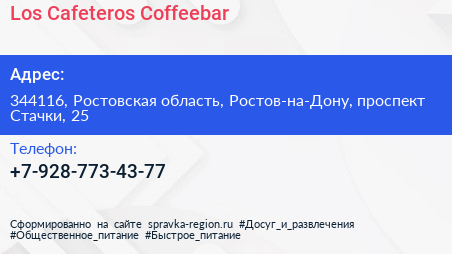 Los Cafeteros Coffeebar по адресу 344116, Ростовская область, Ростов-на-Дону, проспект Стачки, 25 в дальнейшем Организация, размещена в следующих категориях: