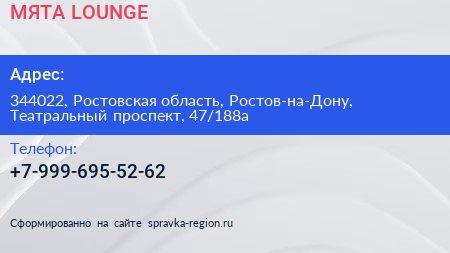 МЯТА LOUNGE по адресу 344022, Ростовская область, Ростов-на-Дону, Театральный проспект, 47/188а в дальнейшем Организация, размещена в следующих категориях: