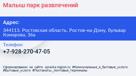 Малыш, парк развлечений по адресу 344113, Ростовская область, Ростов-на-Дону, бульвар Комарова, 36а в дальнейшем Организация, размещена в следующих категориях: