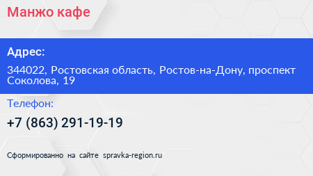 Манжо, кафе по адресу 344022, Ростовская область, Ростов-на-Дону, проспект Соколова, 19 в дальнейшем Организация, размещена в следующих категориях:
