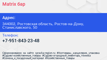 Matrix, бар по адресу 344002, Ростовская область, Ростов-на-Дону, Станиславского, 50 в дальнейшем Организация, размещена в следующих категориях: