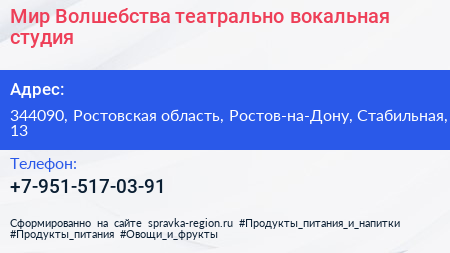 Мир Волшебства, театрально-вокальная студия по адресу 344090, Ростовская область, Ростов-на-Дону, Стабильная, 13 в дальнейшем Организация, размещена в следующих категориях:
