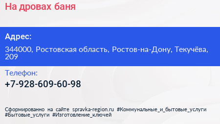 На дровах, баня по адресу 344000, Ростовская область, Ростов-на-Дону, Текучёва, 209 в дальнейшем Организация, размещена в следующих категориях: