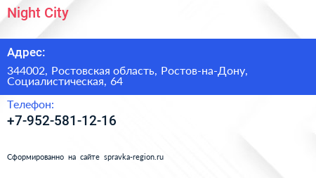 Night City по адресу 344002, Ростовская область, Ростов-на-Дону, Социалистическая, 64 в дальнейшем Организация, размещена в следующих категориях: