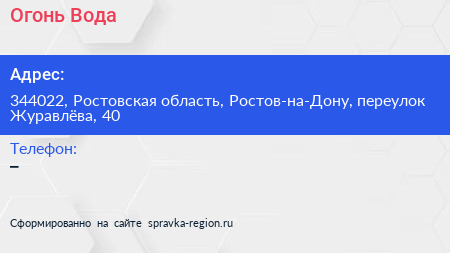 Огонь Вода по адресу 344022, Ростовская область, Ростов-на-Дону, переулок Журавлёва, 40 в дальнейшем Организация, размещена в следующих категориях: