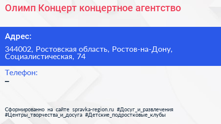 Олимп-Концерт, концертное агентство по адресу 344002, Ростовская область, Ростов-на-Дону, Социалистическая, 74 в дальнейшем Организация, размещена в следующих категориях: