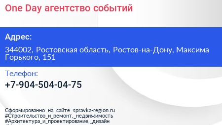 One Day, агентство событий по адресу 344002, Ростовская область, Ростов-на-Дону, Максима Горького, 151 в дальнейшем Организация, размещена в следующих категориях: