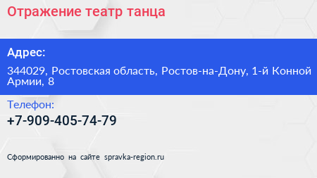 Отражение, театр танца по адресу 344029, Ростовская область, Ростов-на-Дону, 1-й Конной Армии, 8 в дальнейшем Организация, размещена в следующих категориях:
