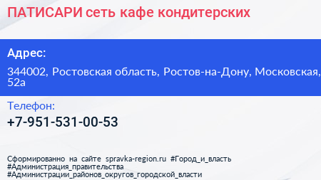 ПАТИСАРИ, сеть кафе-кондитерских по адресу 344002, Ростовская область, Ростов-на-Дону, Московская, 52а в дальнейшем Организация, размещена в следующих категориях: