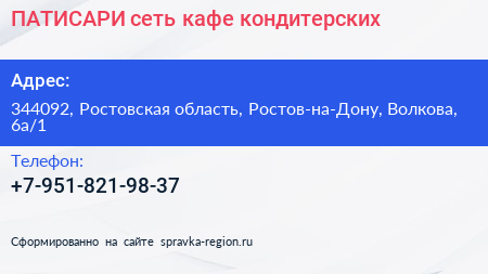 ПАТИСАРИ, сеть кафе-кондитерских по адресу 344092, Ростовская область, Ростов-на-Дону, Волкова, 6а/1 в дальнейшем Организация, размещена в следующих категориях: