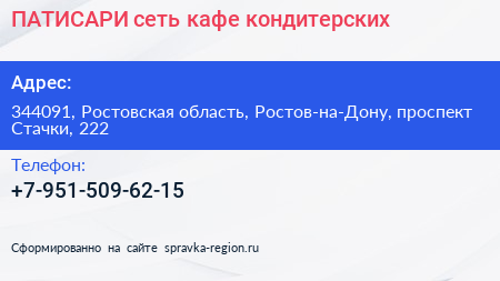 ПАТИСАРИ, сеть кафе-кондитерских по адресу 344091, Ростовская область, Ростов-на-Дону, проспект Стачки, 222 в дальнейшем Организация, размещена в следующих категориях: