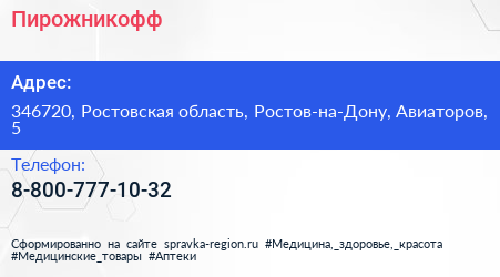 Пирожникофф по адресу 346720, Ростовская область, Ростов-на-Дону, Авиаторов, 5 в дальнейшем Организация, размещена в следующих категориях: